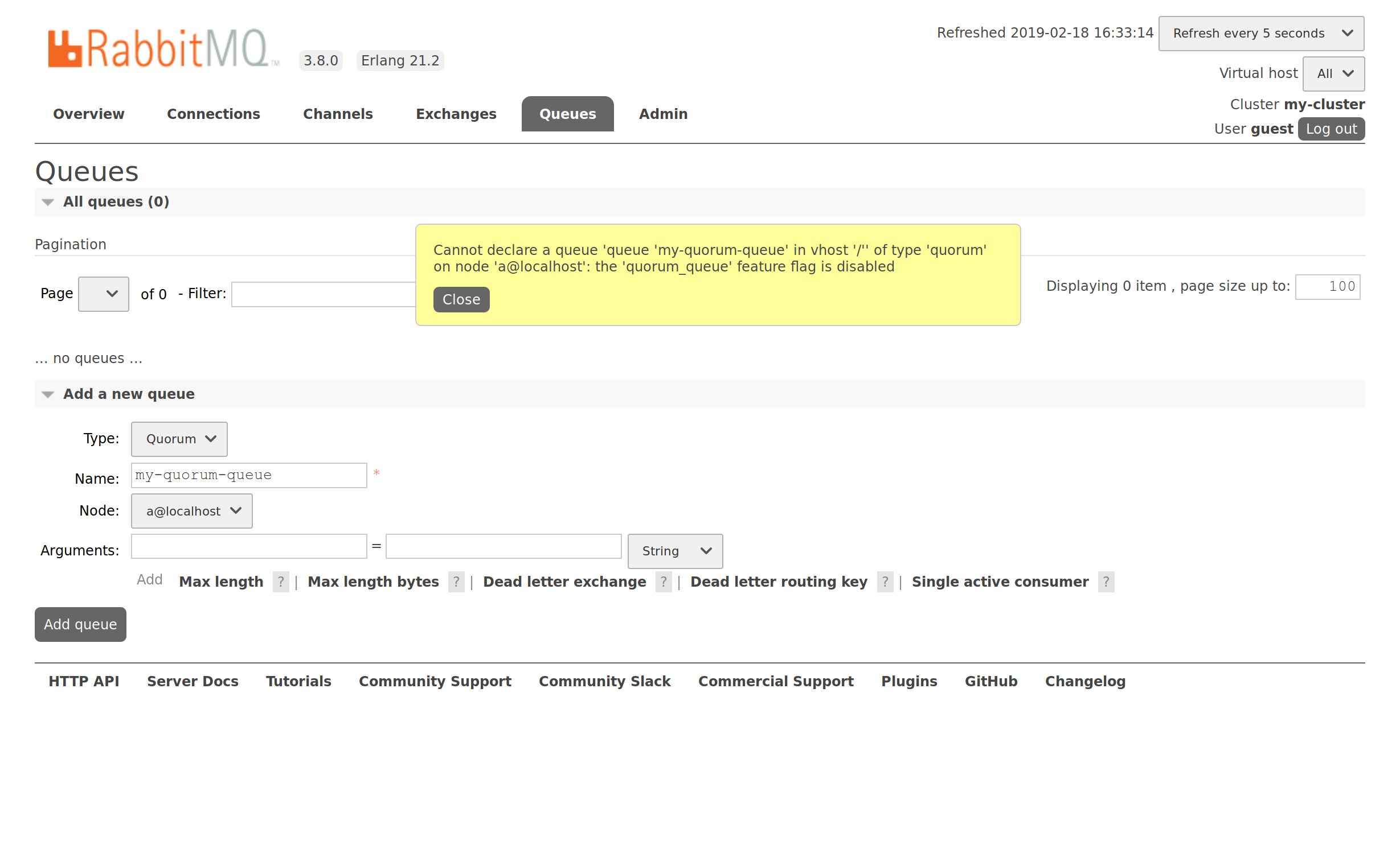 For instance, we could try to declare a quorum queue on node A, but it is denied: